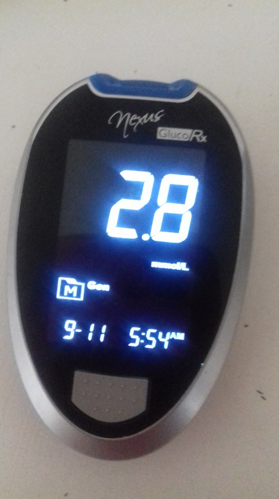 As you can see from the picture, I had a “serious and important hypo” this morning, thanks to undereating and walking too enthusiastically yesterday. Oof. It happens.